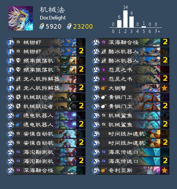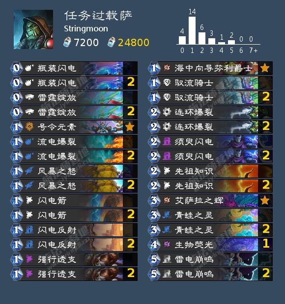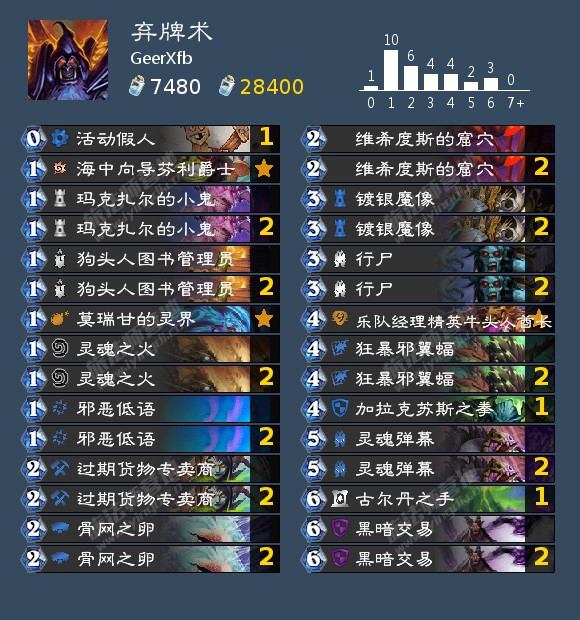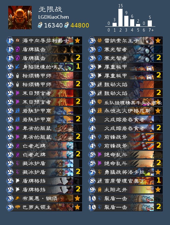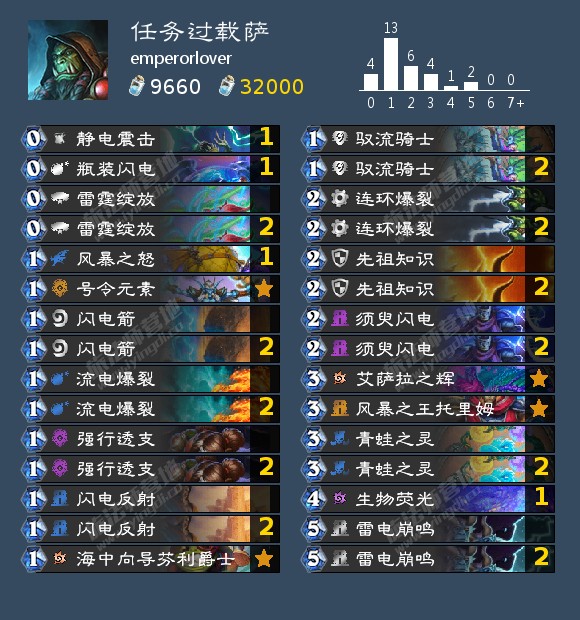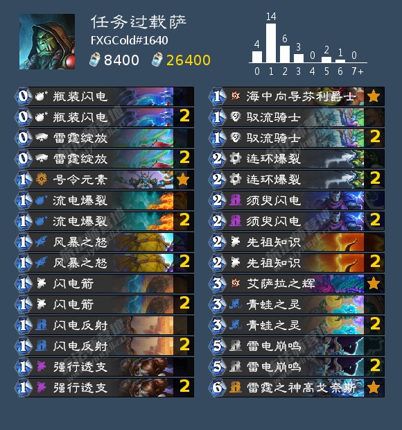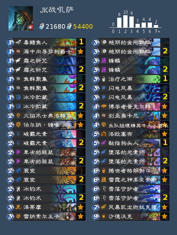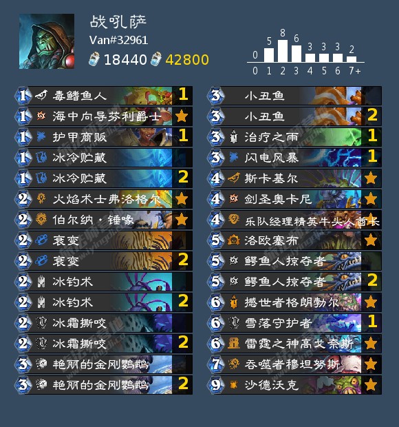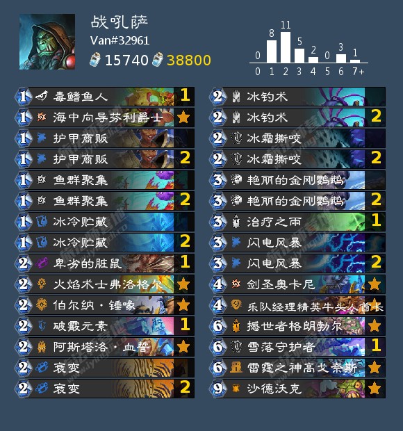 3鱼战吼萨打到前10,针对版本T0弃牌术,卡组对比以往的3鱼体系加了新卡雷霆之神高戈奈斯(站解一体,单解小鬼骑士,滤闪电风暴),补充了两张冰霜撕咬,一张破霰元素,牛里面是冰川裂片,后台保镖,洛欧塞布。