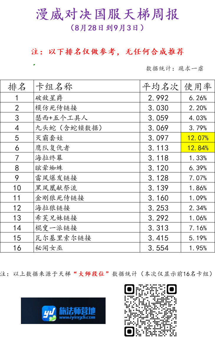 本周报数据仅做参考,不代表卡组在“动态天梯”的适应性,不做任何卡组推荐、合成: