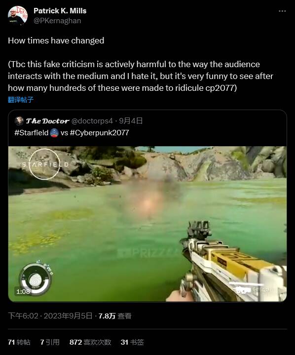 《赛博朋克2077》高级开发者 Patrick K. Mills 在推特上回应了一个将《星空》与《2077》对比的视频。视频对比了两款游戏中玩家在书中游泳、手雷爆炸,以及 NPC 在被武器指着时的反应等。整体上,视频似乎是对《星空》的批评。