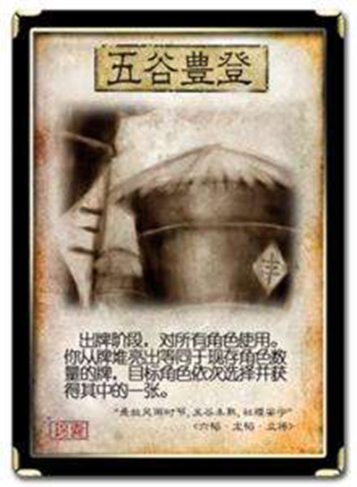 这张锦囊牌可以说是最不受玩家待见的,一般都是用来弃掉。其实五谷丰登也能在很多关键时刻发挥作用,直接决定游戏的胜败。当然这张锦囊牌的使用时机非常重要,如果乱用的话,反而会让敌人获益。首先使用五谷丰登必须看位置,起码队友得在自己的下家,而且要确保对面没有无懈可击,否则用了之后大概率是亏的。或者自己这边有无懈可击,这时候使用五谷丰登才会更划算,不然就是帮人做嫁衣。此外这张牌还能用来针对一些武将,比如空城的诸葛亮,或者是用来克制马良的自书等。总之五谷丰登的使用时机非常考验玩家的技术。