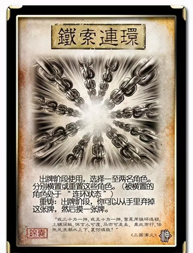 有一说一,铁索连环这张锦囊牌绝对是非常有价值的存在,很多大场面都是由这张牌来制造的,只要用好了上限真的非常高。普通玩家大都不爱用铁索连环,一般都是直接重铸掉,这属实有些浪费了。铁索不仅可以把敌人连在一起打高爆发伤害,同时也可以把队友和敌人连起来,用间接的方式来打伤害,这样就能克制一些不能直接对他出杀的武将。
