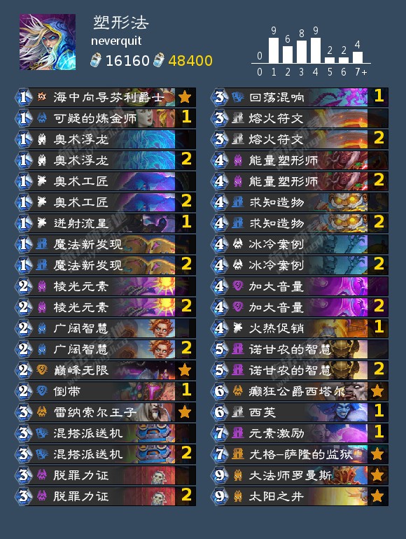 由于是偏娱乐向的卡组,就不分析对局了,主要讲一下整套卡组的思路:通过大量的法术衍生牌,利用能量塑形师进行“手牌愚人”,然后拿到节奏,然后可利用大法师进行组合技。