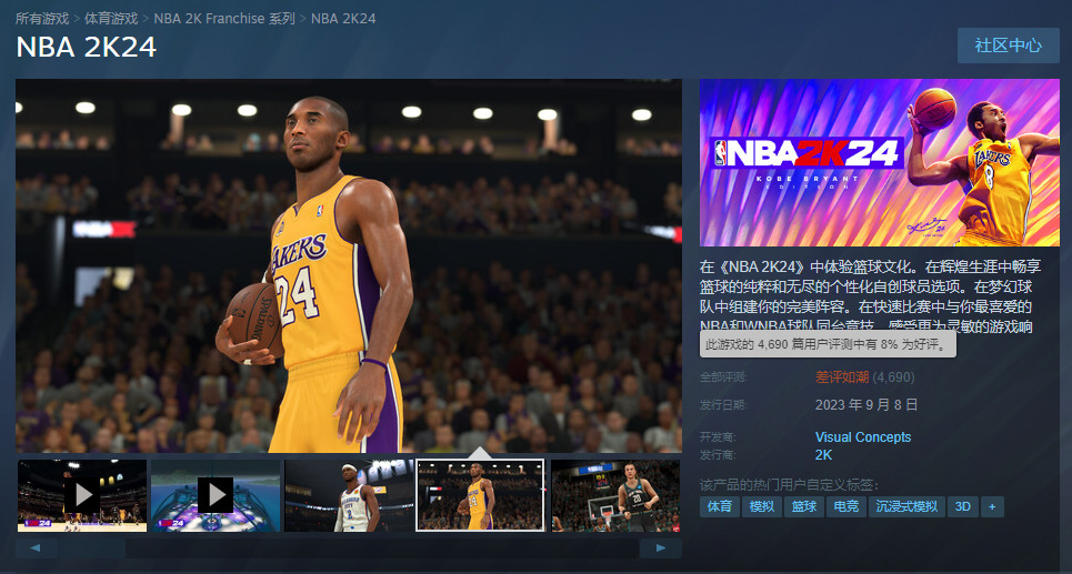 根据Steam250的数据,《NBA 2K24》现已超越《守望先锋2》成为Steam差评榜第一,商店页面显示好评率仅为8%,而《守望先锋2》为9%,这距离《NBA 2K24》发售仅过去了一周时间(9月8日发售)。