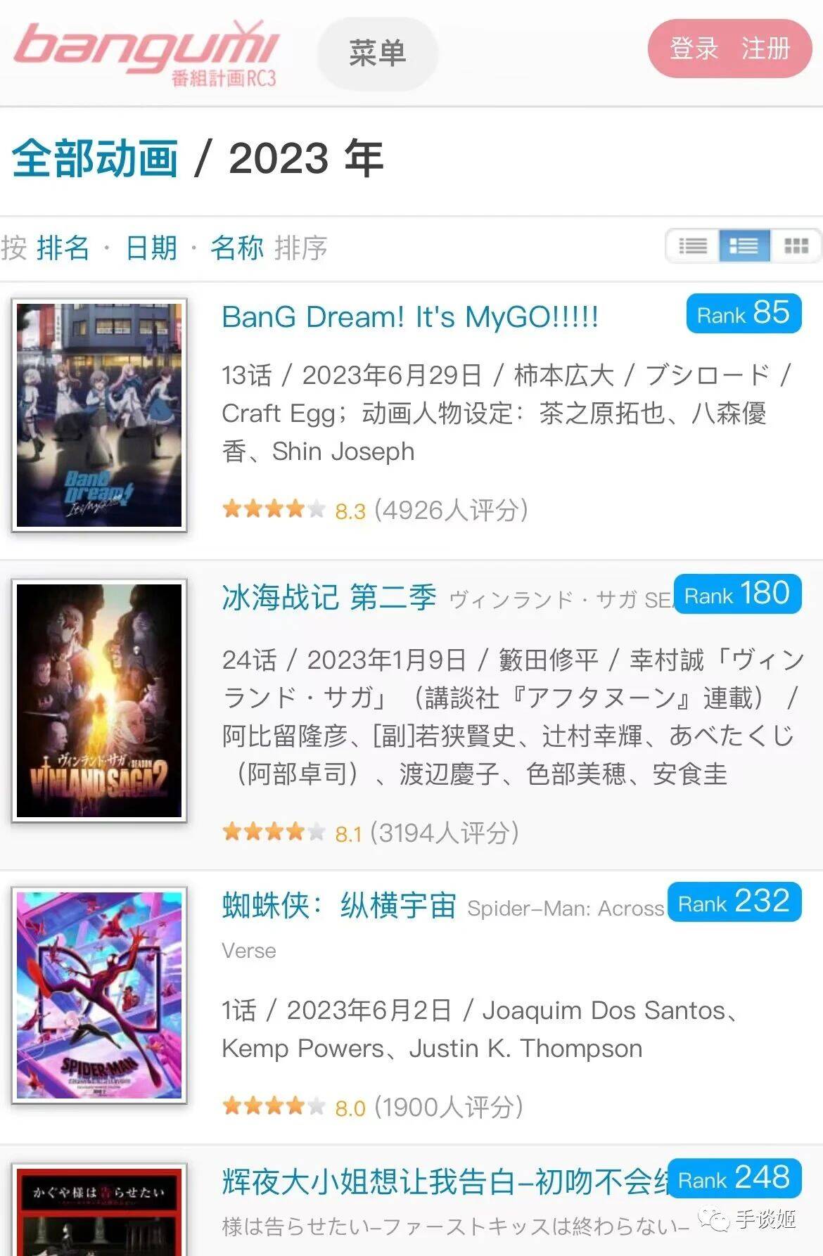 且,在另一个带有wiki性质的网站bangumi上,mygo评分位居今年动画第一!依旧遥遥领先!