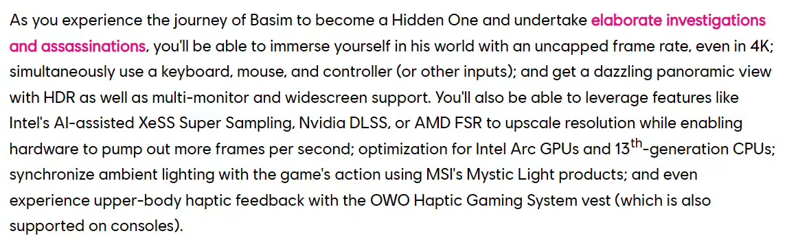 日前育碧在博文中确认了本作也会支持英伟达 DLSS 和 AMD FSR 技术,育碧同时声称在这款游戏中,官方和英特尔进行了合作,为英特尔 Arc GPU 及 13 代酷睿处理器进行了优化。