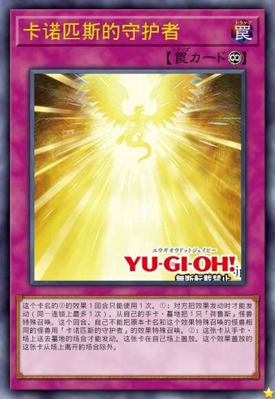 ①:对方把效果发动时才能发动(同一连锁上最多1次)。从自己的手卡·墓地把1只「荷鲁斯」怪兽特殊召唤。这个回合,自己不能把原本卡名和这个效果特殊召唤的怪兽相同的怪兽用「卡诺匹斯的守护者」的效果特殊召唤。