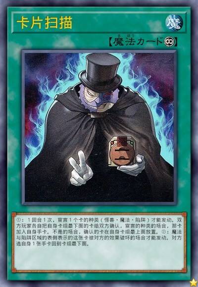 [魔法|永续]①:1回合1次,宣言1个卡的种类(怪兽·魔法·陷阱)才能发动。双方玩家各自把自身卡组最下面的卡给双方确认,宣言的种类的场合,那卡加入自身手卡。不是的场合,确认的卡在自身卡组最上面放置。