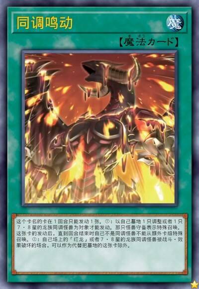 ①:以自己墓地1只调整或者1只7·8星的龙族同调怪兽为对象才能发动。那只怪兽守备表示特殊召唤。这张卡的发动后,直到回合结束时自己不是同调怪兽不能从额外卡组特殊召唤。
