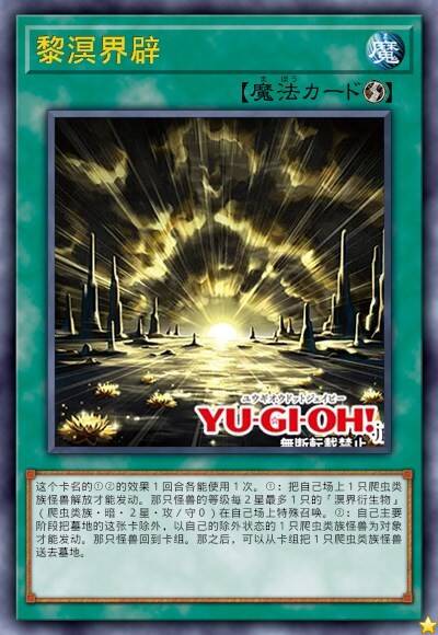 ①:把自己场上1只爬虫类族怪兽解放才能发动。那只怪兽的等级每2星最多1只的「溟界衍生物」(爬虫类族·暗·2星·攻/守0)在自己场上特殊召唤。