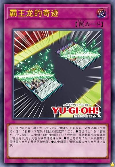 ①:把自己场上1只原本攻击力是2500的魔法师族灵摆怪兽解放才能发动。自己的手卡·卡组·额外卡组·场上·墓地的怪兽作为融合素材除外,把1只「霸王龙 扎克」融合召唤。除自己的除外状态的「灵摆龙」「超量龙」「同调龙」「融合龙」怪兽各存在的场合外,这个效果特殊召唤的怪兽的效果无效化。