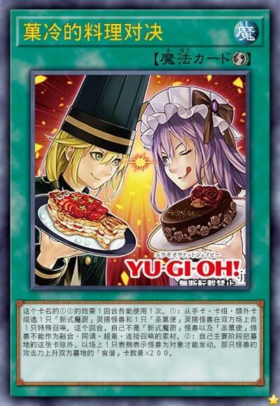 ①:从手卡·卡组·额外卡组选1只「新式魔厨」灵摆怪兽和1只「圣菓使」灵摆怪兽在双方场上各1只特殊召唤。这个回合,自己不是「新式魔厨」怪兽以及「圣菓使」怪兽不能作为融合·同调·超量·连接召唤的素材。