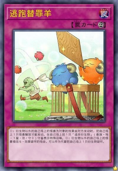 ①:衍生物以外的自己场上的怪兽为对象的效果由对方发动时,把自己场上1只怪兽解放才能发动。在自己场上把1只「逃羊衍生物」(兽族·地·1星·攻/守0)守备表示特殊召唤。