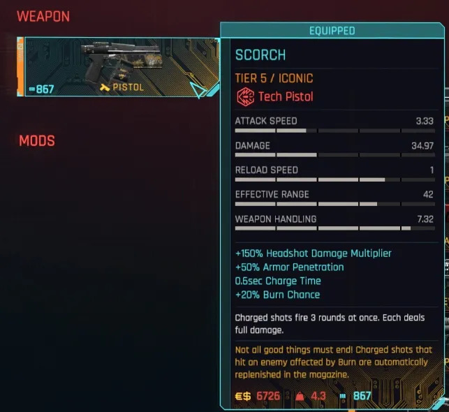 以下两张图分别是“灼烧”技术手枪和“白狼”剑的武器数据。“灼烧”能够有 20% 几率给敌人造成燃烧 Debuff,而蓄能攻击已经燃烧的敌人则会返还所有使用的 3 发子弹;“白狼”则会对 Boss 造成额外伤害,同时在快速击杀多名敌人后,后续一段时间内所有攻击都将是暴击,该 Buff 会在击杀敌人后刷新,并且在玩家生命值很低时所有攻击都会暴击且会恢复生命值,可以说非常的强力。