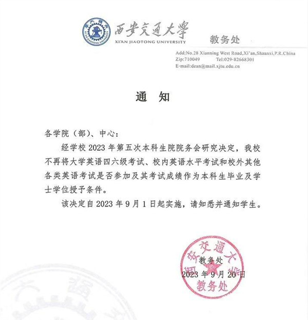 9月21日,网传西安交通大学教务处发布通知:经学校2023年第五次本科生院院务会研究决定,学校不再将大学英语四六级考试、校内英语水平考试和校外其他各类英语考试是否参加及其考试成绩作为本科生毕业及学士学位授予条件。
