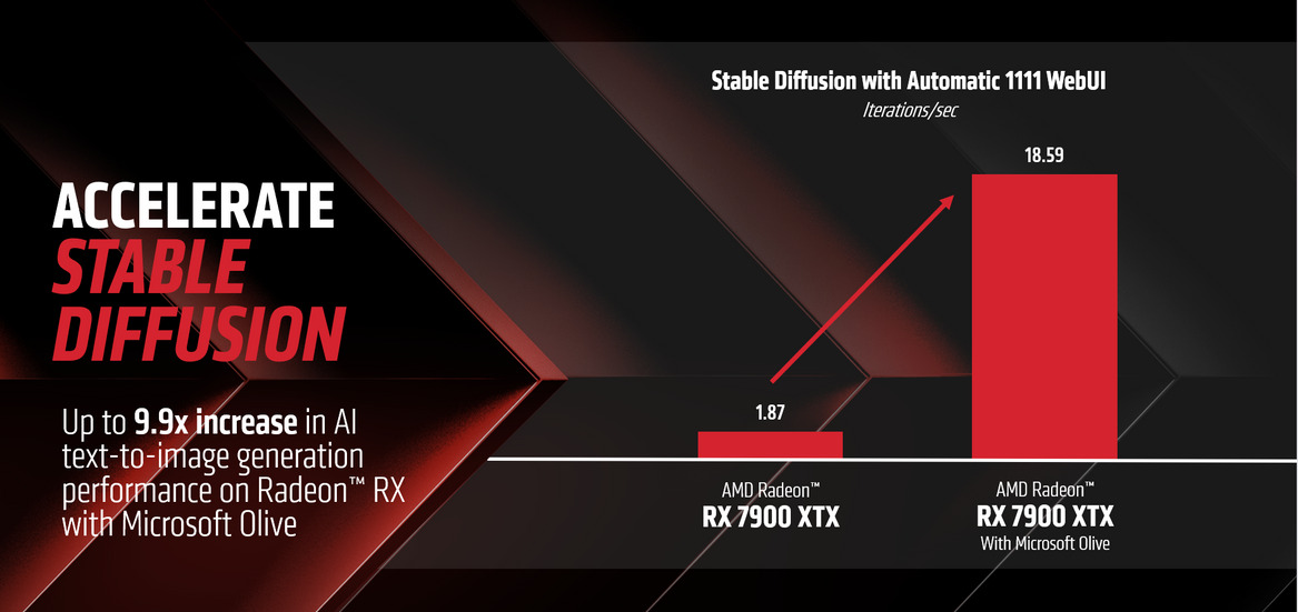 按照AMD实测的数据,RX 7900 XTX在默认PyTorch路径上运行,每秒可提供1.87次迭代,而换到Microsoft Olive的优化模型上运行,每秒可提供18.59次迭代,也就是性能提升多达9.9倍!