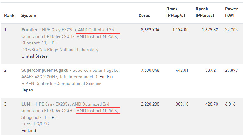 尤其是顶级满血的MI250X战绩彪炳,目前公开性能世界第一、已经三连冠的超算“Frontier”,就是基于它打造的,最大性能高达119.4亿亿次浮点每秒,是第二名的多达2.7倍,峰值性能更是168亿亿次浮点每秒,是第二名的3倍还多!
