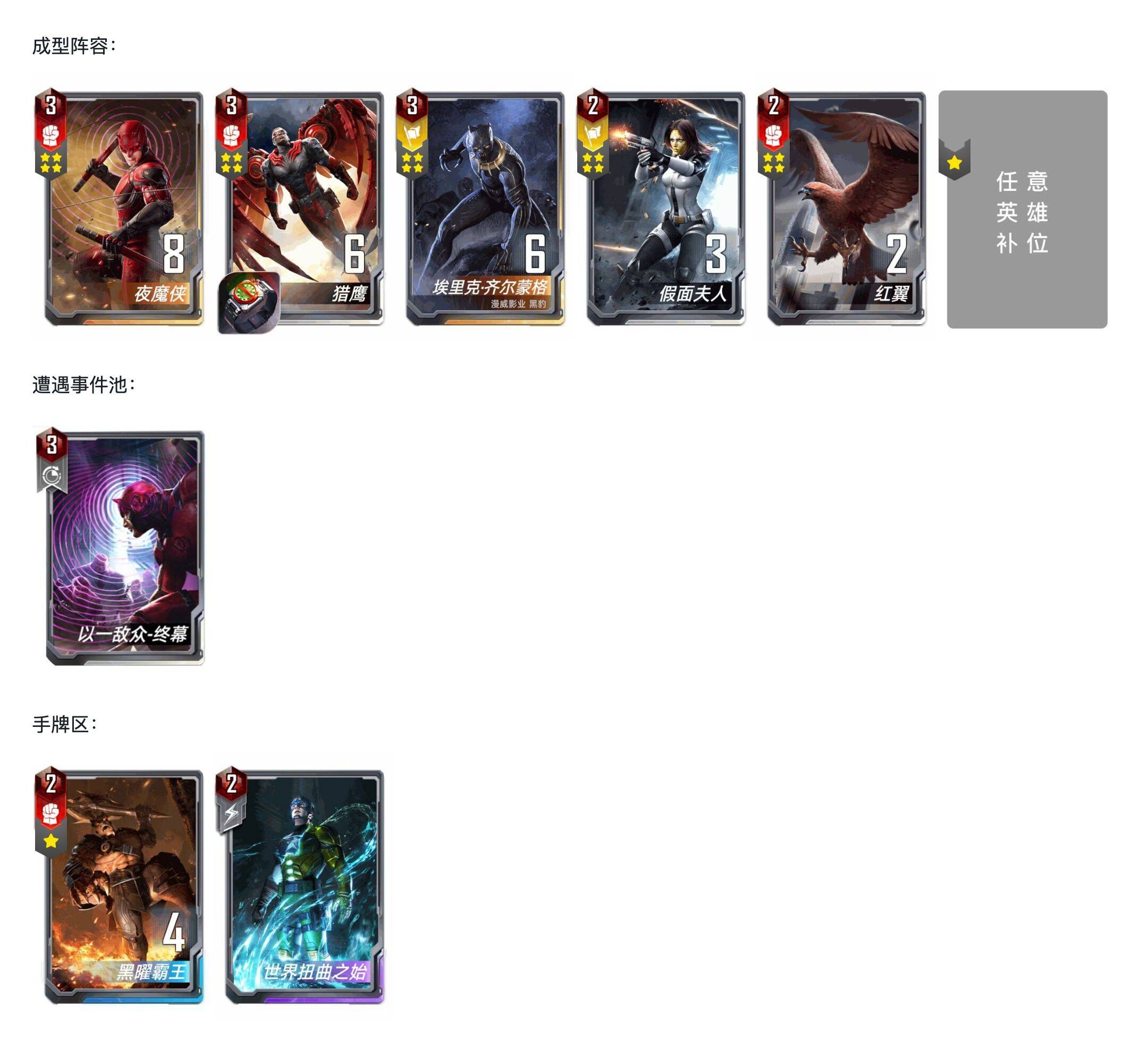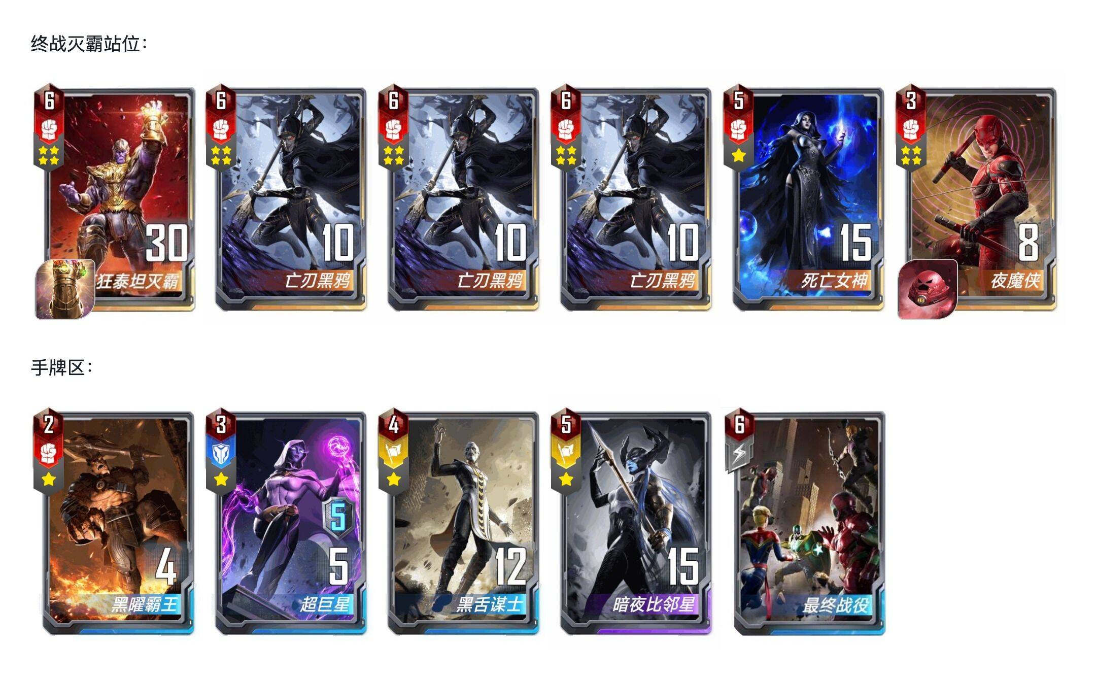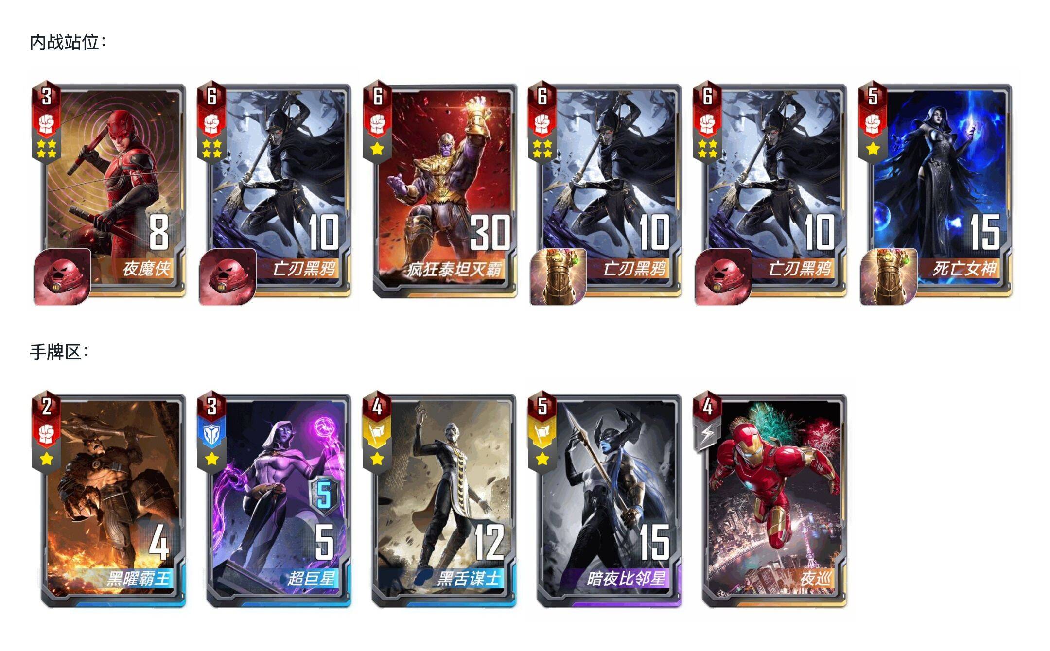 1、同行内战:这套卡组打内战还是比较有优势的,身材比不过就直接夜巡灭霸,然后用夜魔侠输出