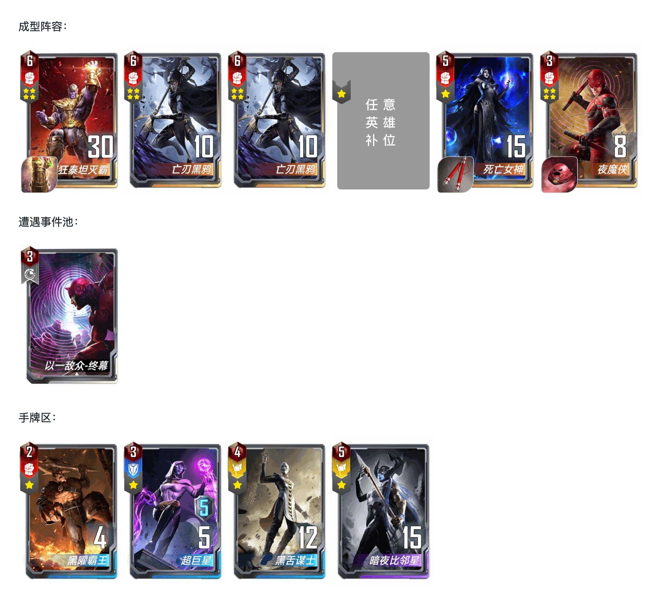 技巧:1、拿牌优先:精神寄生>黑鸦>武器>事件>其他角色;2、灭霸养不大可以打双手套或3手套,C夜魔侠;3、带无人机的话,4星黑鸦不上武器,遇到无人机就卖6费卡;4、寄生任意两费角色可获得超巨星,通过黑鸦发现2星回手或并肩回手