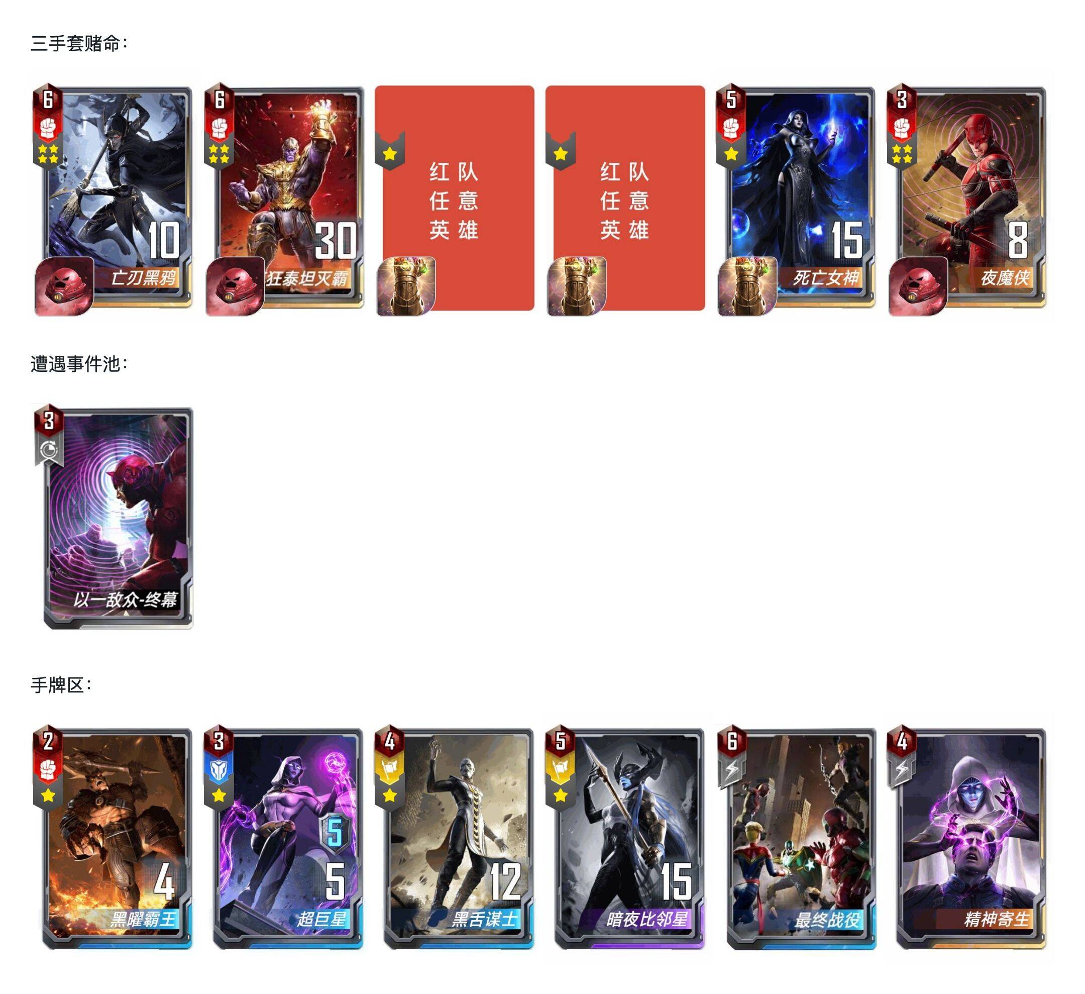 3、3手套赌命:当我们灭霸身材不大,对面还有可能贴膜的时候就可以试试3手套赌命的玩法,手上备好足够的寄生事件,不要全上黑鸦,以及其他的教团角色,终战过后活下来,大概率我们还是很好赢的,另**3个以上的手套就没必要了,因为手套大概率会杀自己带手套角色,能打出3个手套已经是极限了