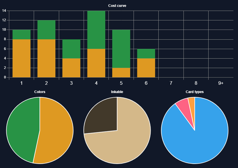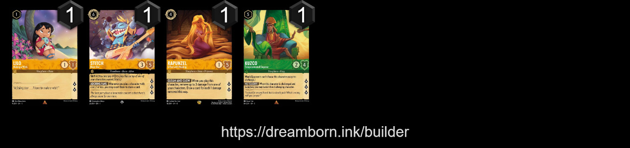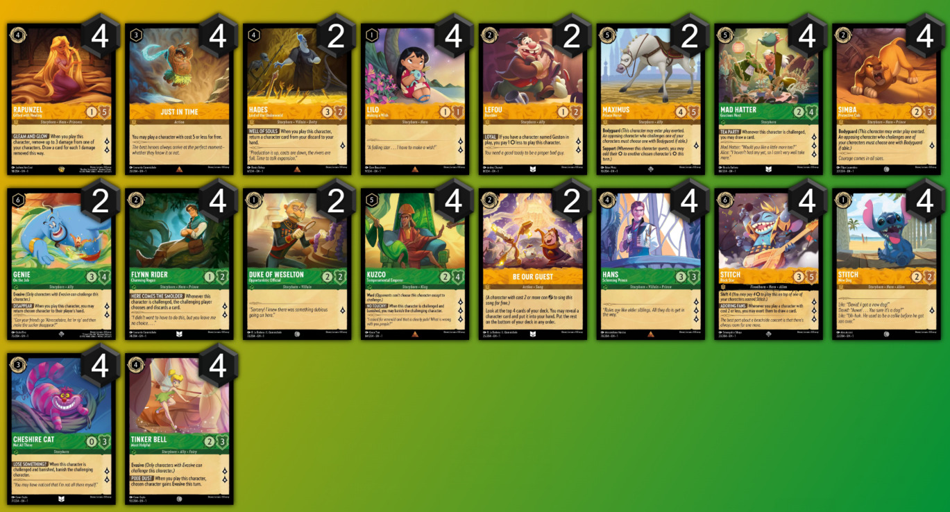 这套牌由32黄和28绿组成,墨池牌44张,除6张行动牌之外,全部是角色牌。由于墨牌占的大部分,基本很少会出现卡手情况,前期莉萝辛巴组合能让对手3回合有压力寻求解牌。在铺场的同时又有摇滚史迪奇过牌,乐佩过牌等手段,在对方叫解场后能用国王KUZCO进行斩杀。
