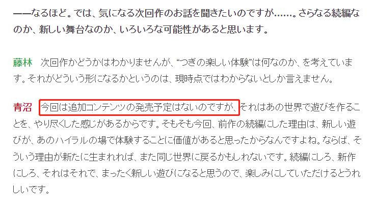 此外,在采访中,Fami通还询问了《王国之泪》是否会成为下一款作品的阻碍,因为此前《旷野之息》的成功被认为是续作推出的阻碍,而《王国之泪》再次超越了这一点。游戏总监藤林秀麿对此表示,开发团队并不认为这是一个阻碍,请玩家敬请期待,开发者将尽最大努力让下一款作品变得有趣。