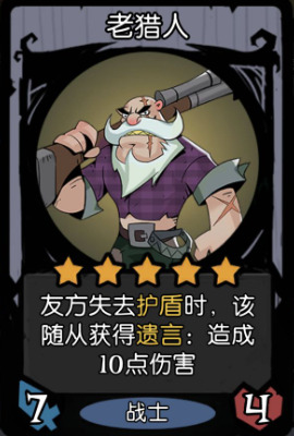 阵容核心思路就是不停的套圣盾,依靠圣盾保护来白嫖一波伤害,不过我们还有planB做保障,老猎人可以压轴给对手核心一击,成型后观赏性比较高,伤害也可观。加上咒术卡和装备卡的效果,先手可以触发很多次,攻击也可以达到翻倍的效果(具体要看发牌员给你发什么装备卡,法力护盾这张卡是比较关键的),不过只要是战力的卡都可以适配这套阵容。