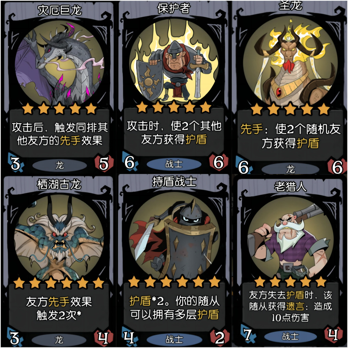 疯狂和一些攻击类收益的卡优先给灾厄巨龙和保护者,先手类的卡给圣龙,圣盾和加生命类的卡给栖湖古龙。