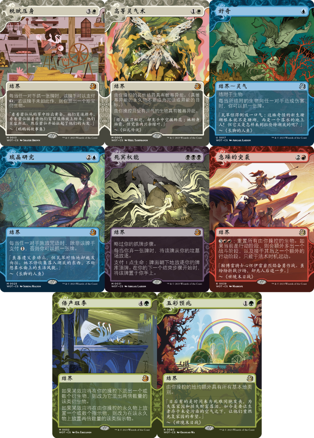 一批经典的结界牌将以魅附奇谭的形式回归艾卓,这些额外牌张为特殊的无边框牌,配有童话主题的插画。