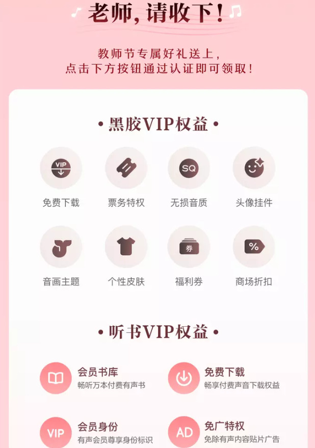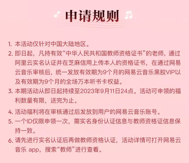 据了解,凡持有效“中华人民共和国教师资格证书”的老师,通过阿里云实名认证并在芝麻信用上传本人的资格证书,在通过网易云音乐审核后,统一发放有效期为9个月的黑胶VIP和9个月的全场万本听书卡权益。