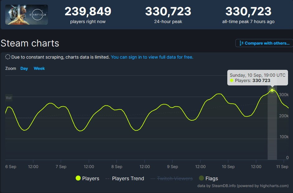 据Steamdb数据显示,9月10日晚上7点《星空》Steam玩家同时在线人数峰值已达330,723万。这也超越了《上古卷轴5》历史峰值(28.7万),但距离《辐射4》(47.2万)还有些距离。