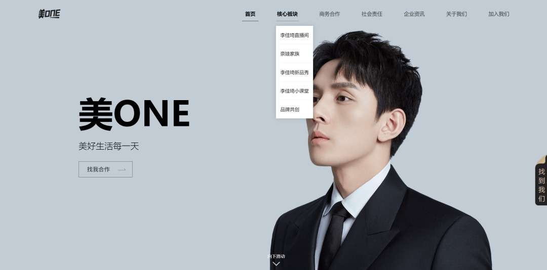 但即便如此,点开李佳琦背后的公司美 ONE 的主页,迎面依旧是一张巨大的李佳琦海报。