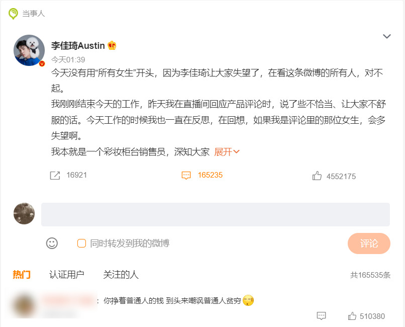 虽然李佳琦立马就跳出来道歉,但已经没办法控制观众们的情绪了。
