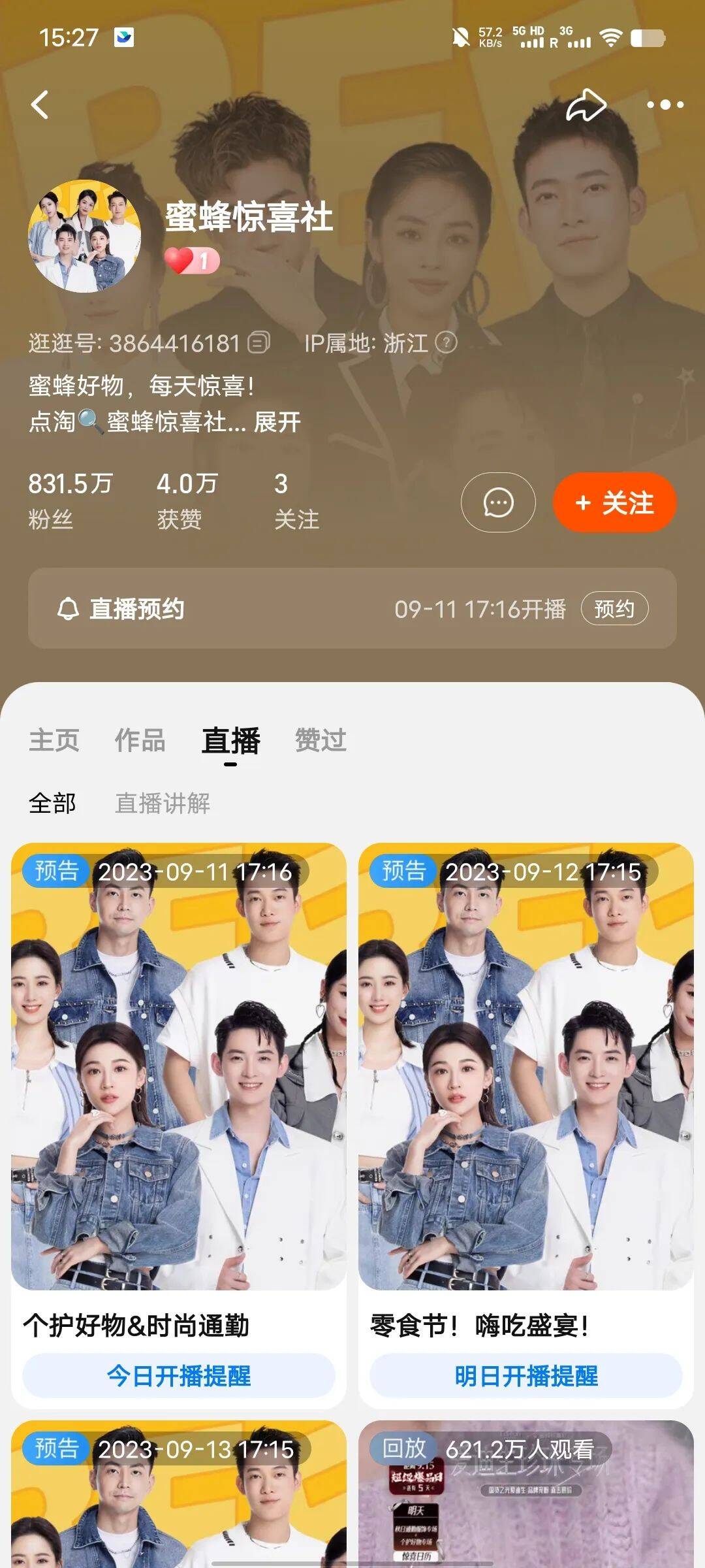 总共包含三个直播间:蜜蜂惊喜社、蜜蜂心愿社、蜜蜂欢乐社,分别从 8 点到晚上 12 点,全天候的直播轮岗。