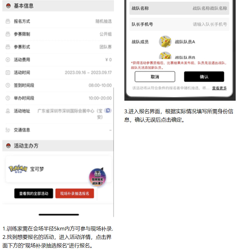 报名方法:9月13日18:00:00至9月14日23:59:59,训练家可通过“宝可梦卡牌会员”小程序“活动”-“按类型找”-“王者争夺赛”(需定位至深圳市)找到本次活动并进行报名。9月15日起,训练家可自行查看抽选结果。