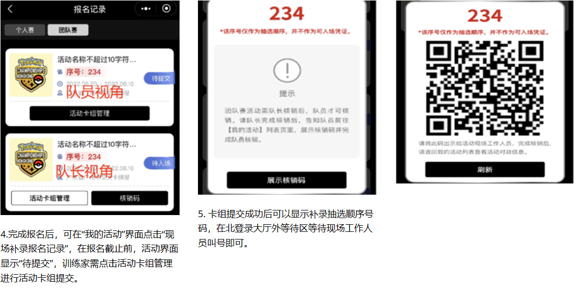 公开组(现场补录抽选顺序号码1至100号的训练家):战队队长于小程序上获得补录抽选顺序号码(补录方法请见“现场补录”)后,8:00~9:00期间,战队全员需于北登录大厅前等待区集合,等待工作人员通知。战队全员通过补录获得参赛资格后,到达对应窗口出示小程序“我的“界面领取选手证,完成线上实名认证后前往20号馆。只有在队长核销后,战队成员才可进行核销并前往20号馆。