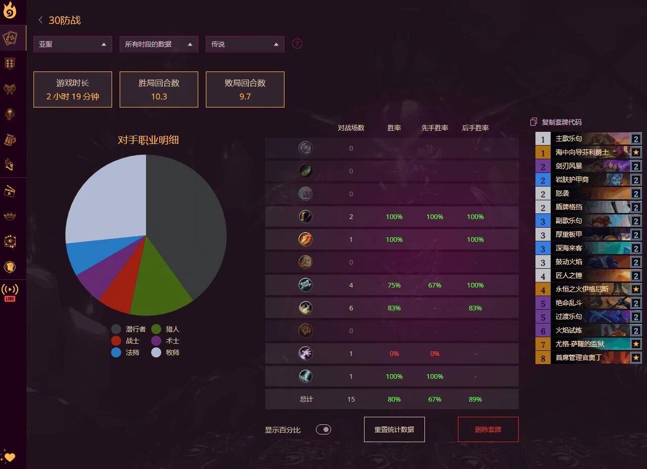 心得:这个卡组我觉得讨论的就两个点,一个是不带泰坦,一个是带了尤格萨隆的监狱。包包认为现在的环境并不适合带泰坦,对于现在的主流卡组,泰坦对机械贼是对局重要留牌的存在,但机械贼并没有占据绝对的数量,而且该卡组尽可能的压缩了随从的数量,保留了过牌探底等,保证了副歌乐句尽可能的抽到抽到首席管理员奥丁可以8费准时,甚至5费跳币上首席管理员奥丁的天局。首席管理员奥丁是卡组核心,泰坦是强势随从,只能说二者不可得兼,舍鱼而取熊掌。至于打控制牧和血dk这种劣势对局,容易出现卑鄙的脏鼠拉首席管理员奥丁的情况,有泰坦只能提高胜率而不能保证获胜,而环境下控制牧不多,血dk近期未见,衡量之下并不带泰坦。至于尤格萨隆的监狱嘛……主播需要有一定的娱乐性,并且总的来说地标还是蛮赚的,严重亏损情况不多。