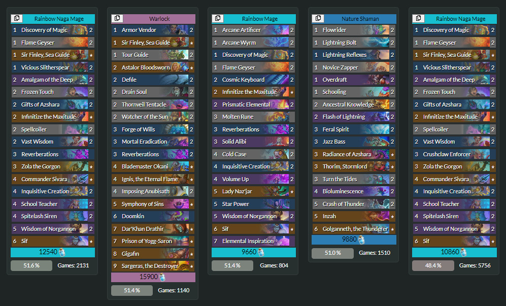 - Firestone内部数据卡组(传说前200分段): 流放瞎,鼓圈德,法强德,纳迦西芙法,多系法,控制牧,机械贼,奥秘贼,过载萨,控制术,巨怪术,40控制术,奥丁战,激怒战