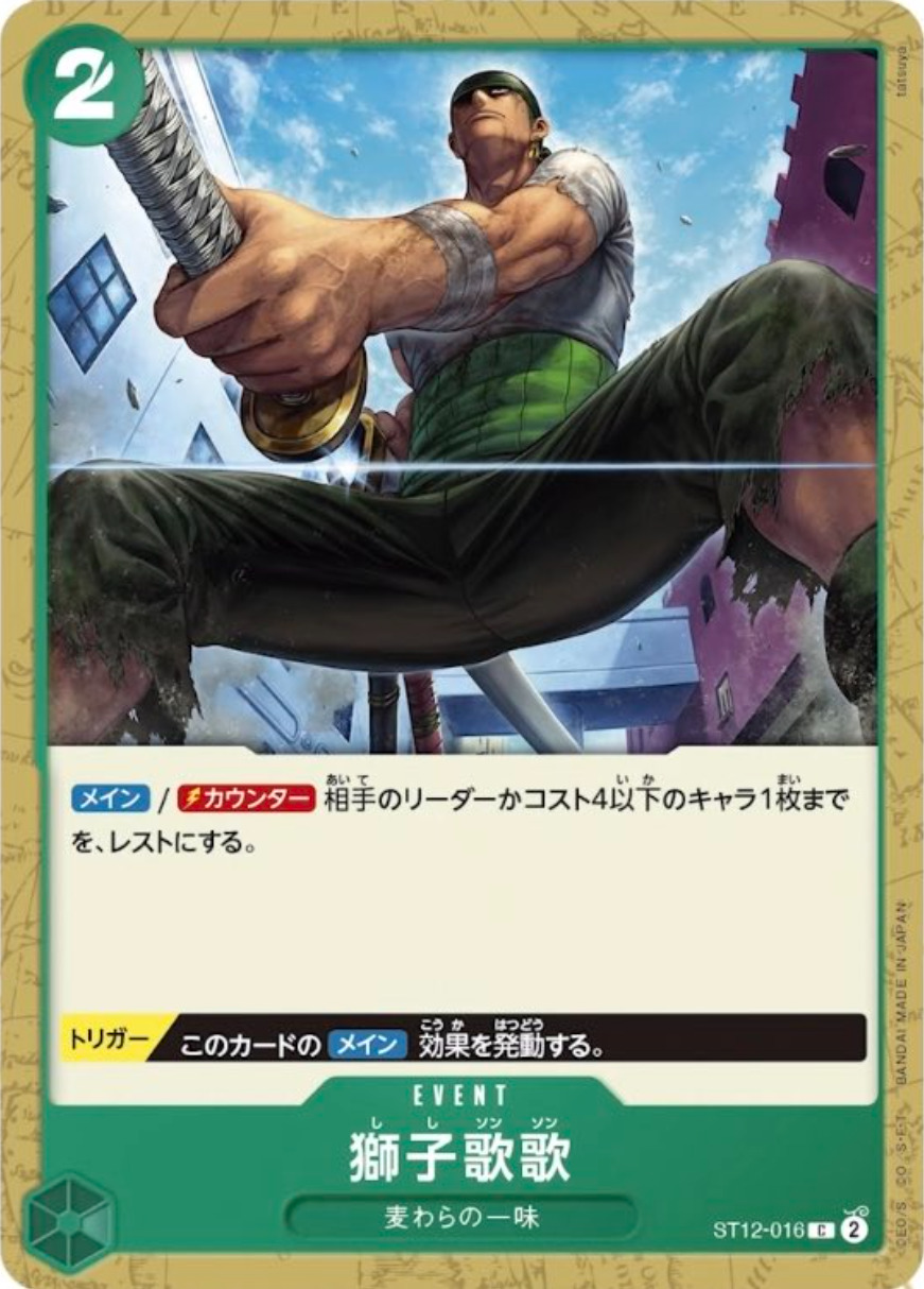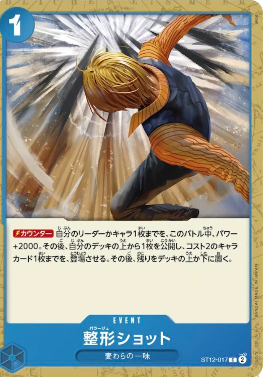 反击:本次战斗中,至多一个领袖或角色力量+2000。然后,公开牌库顶1张牌,将至多一个2费角色登场,其余以任意顺序放回牌库顶或置入牌库底。