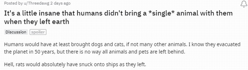 有玩家在reddit论坛发帖称:“人类离开地球时连一只动物都不带,这有点疯狂。不带其他动物,但至少会带走猫狗吧。人类撤离这个星球,不可能把所有动物和宠物都留下来,老鼠绝对会在飞船离开时偷偷溜上船。”