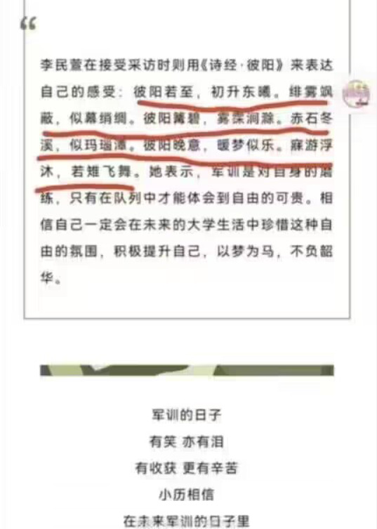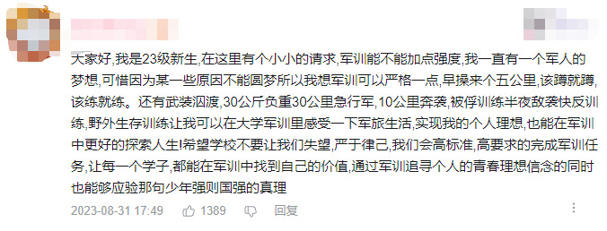 话说回来,军训的目的是让学生感受军旅艰辛,对保家卫国之人建立最基本的敬畏与认同感,同时锻炼自身体魄和意志,去迎接接下来的学习生活。