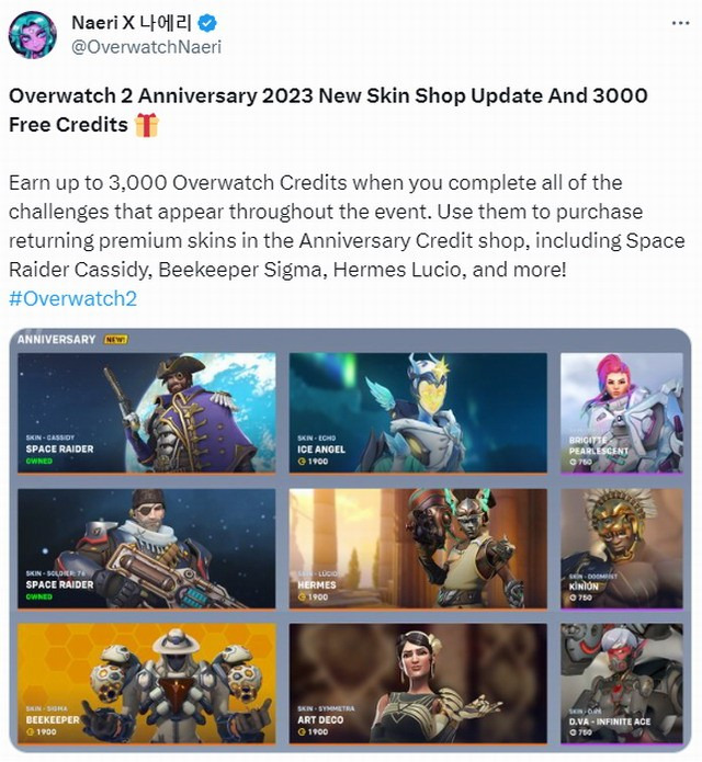 《守望先锋2》2023年周年活动已于9月19日开启,开放新的活动挑战内容,并可在周年商店中购买皮肤。唯一能免费获得的皮肤是“诅咒船长死神”,再加上可购买项目皆为旧造型,被玩家们批评诚意不足,造型回收利用。