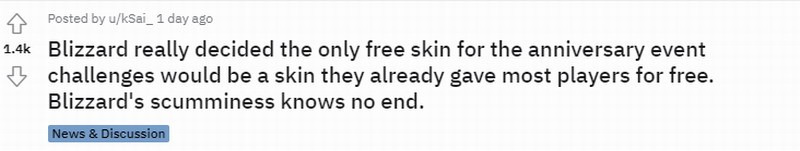 而挑战中唯一可直接获得的免费皮肤,还是当初《守望先锋》改版为《守望先锋2》时,做为补偿免费赠送的死神传说皮肤“诅咒船长死神”,也因此被批评为没诚意,在周年庆时拿一套旧帐号都有的皮肤打发玩家。