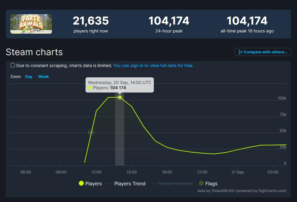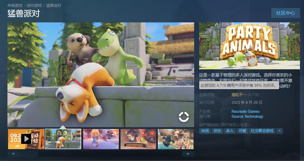 多人派对游戏《动物派对》现已正式发售,该作的Steam玩家峰值人物在发售首日达到了104,174,当时的玩家评价为“多半差评”,好评率为34%,而现在游戏的好评率已涨至56% Steam评测为“褒贬不一”。