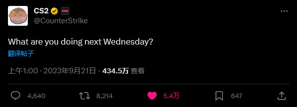 官方推特账号今天(9 月 21 日)提问道:“你们下周三有什么计划?”几乎整个 FPS 社区的热情都被这一条推文点燃,所有人都认为这意味着《CS2》将在 7 天内正式全面推出。