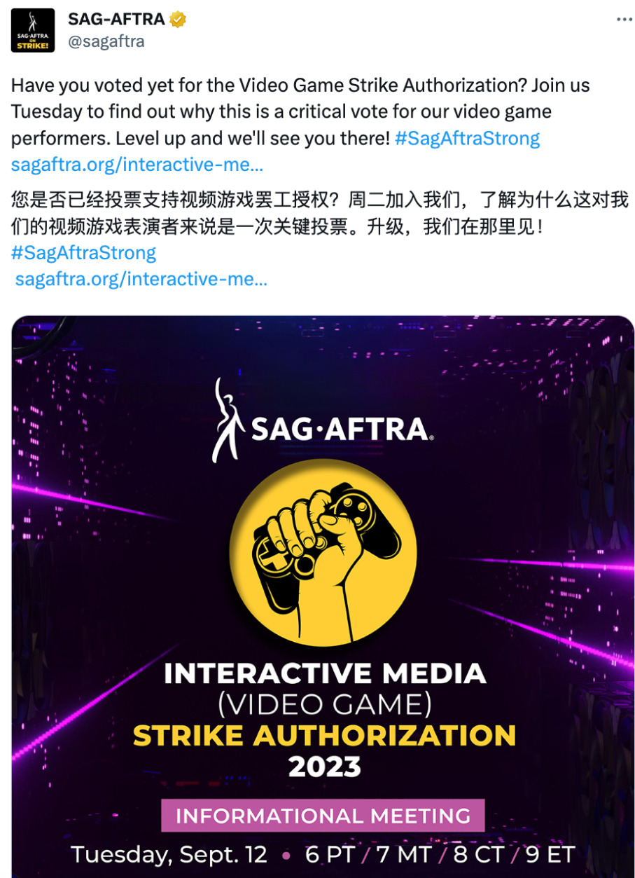 日前,SAG-AFTRA发起了**授权投票,要求与游戏公司进行新一轮谈判。虽然**授权并不意味着直接**,但一旦授权通过,就将允许工会成员在谈判失败后选择**。
