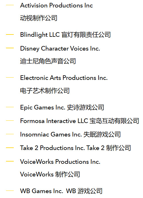 SAG-AFTRA公告中提到的“签约电子游戏公司”包括:
