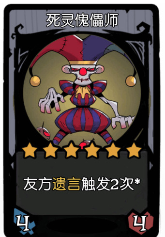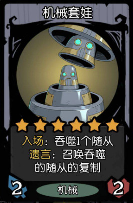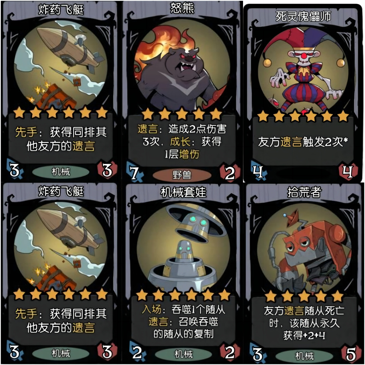 成型后六人口为:炸弹飞艇,怒熊,机械套娃,拾荒者,死灵傀儡师,基本卡牌组成如图所示。
