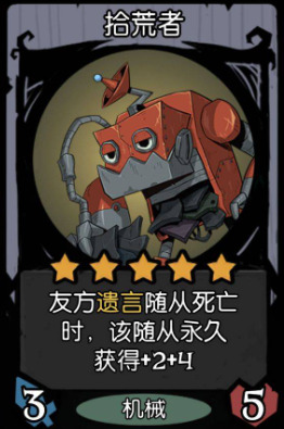 拾荒者的成长也是有讲究的,前期我们如果没有搜到核心卡,可以先用其他遗言卡来过度,稳住血量,当我们搜到拾荒者的时候,可以靠拾荒者保持战斗力,它的成长是看死亡了多少遗言随从,遗言随从像是机械狗(死亡后召唤一个遗言随从)这就是一个位置两个遗言,还有幽灵的五星牌“缚魂棺”,等前面四个位置的遗言随从都嘎掉了,它死了又能召唤五个遗言随从,让拾荒者的成长蹭蹭起飞。如果用上装备牌,死亡+2+2 和焊接器,一个回合成长数据就上百。是个很不错的万金油卡,后期也能提供很高的身材数值。