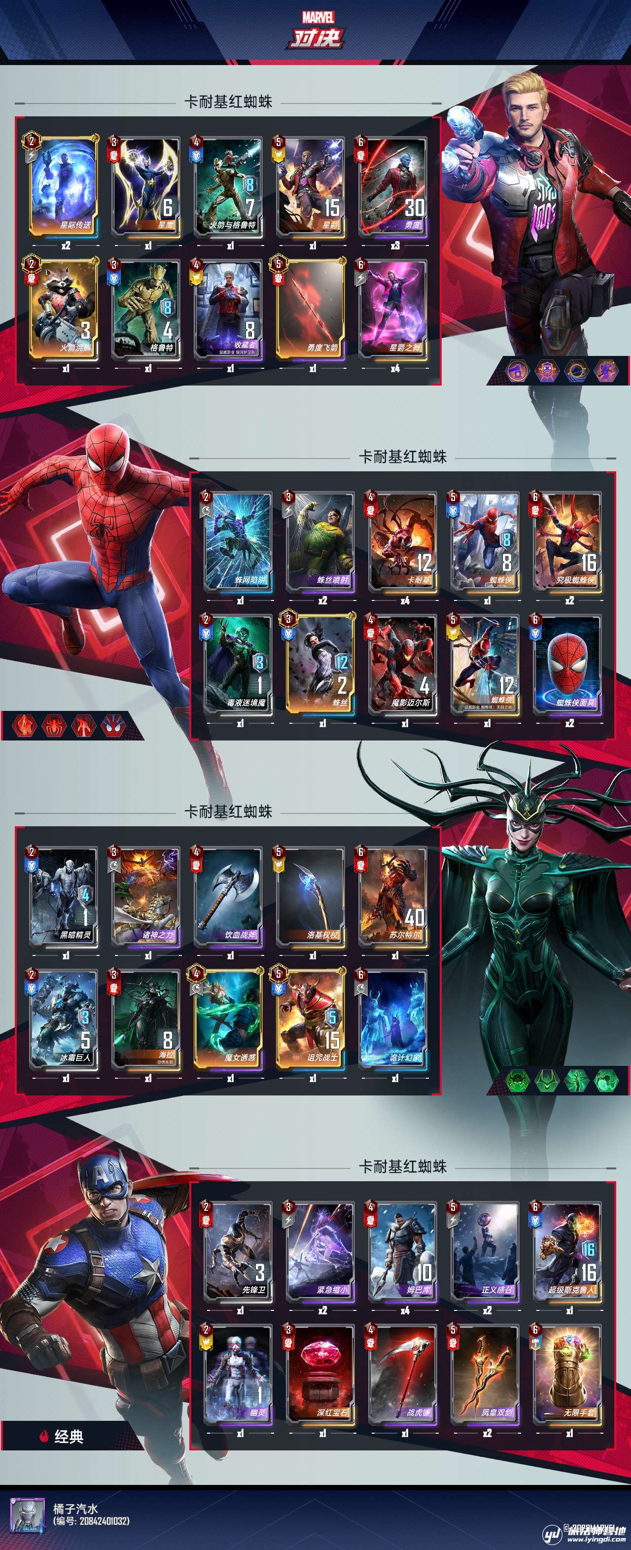 注意的地方:场上不要放太多怪影响卡耐基成长,有蜘蛛技能优先拿蜘蛛技能,星爵的技能也不错也是个适合红队的。没有带钢铁侠是因为这个卡组不缺经济,海拉的斧子和星爵的勇度都很重要,实在不能取舍,只能放弃经济了。