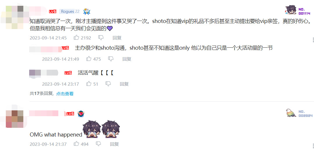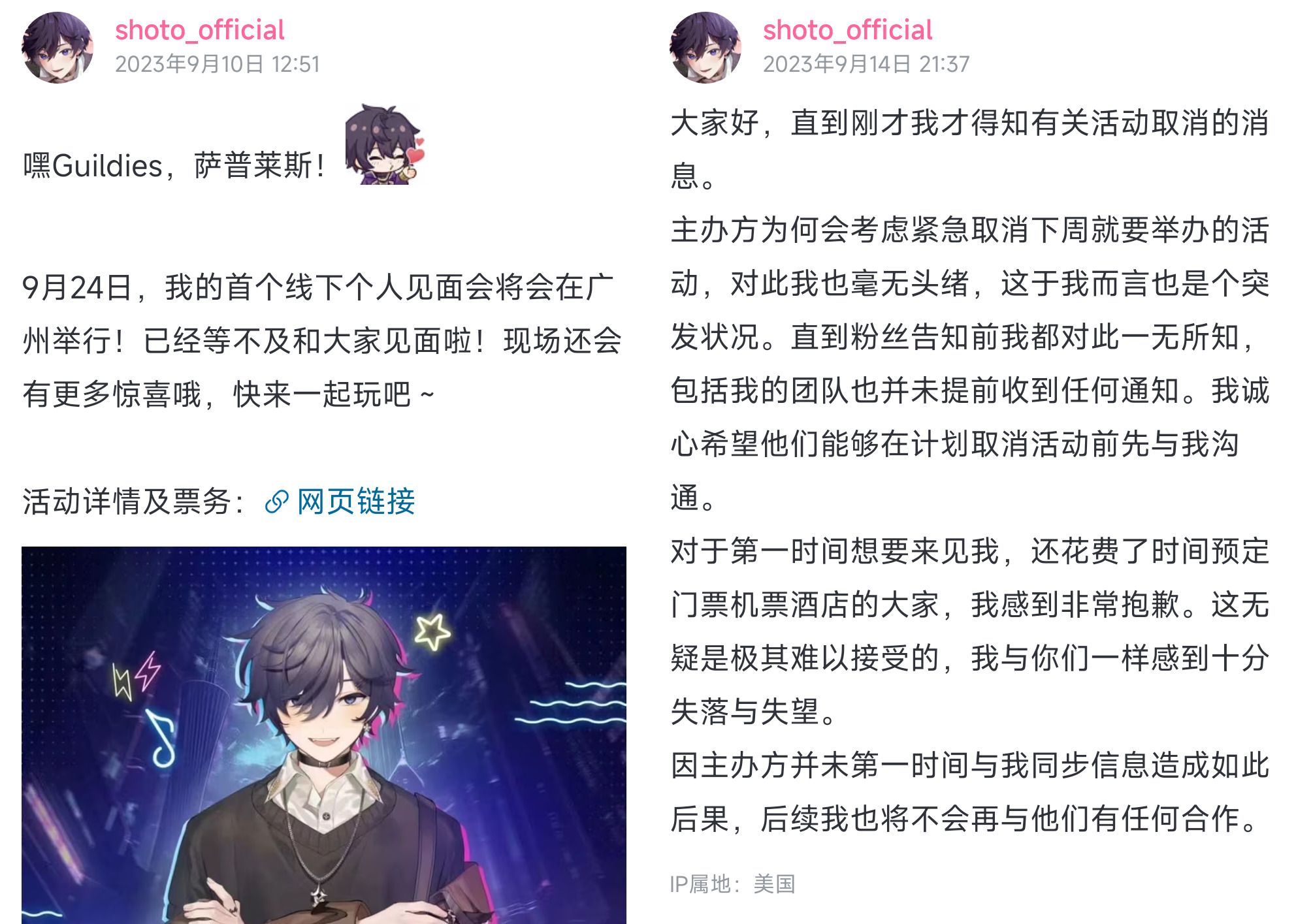 而在这个帖子里提到的“广州漫展线下见面会取消”也不是空穴来风的小道消息,直到今天我们还能直接在这位男V的B站动态里找到活动官宣→取消的消息。